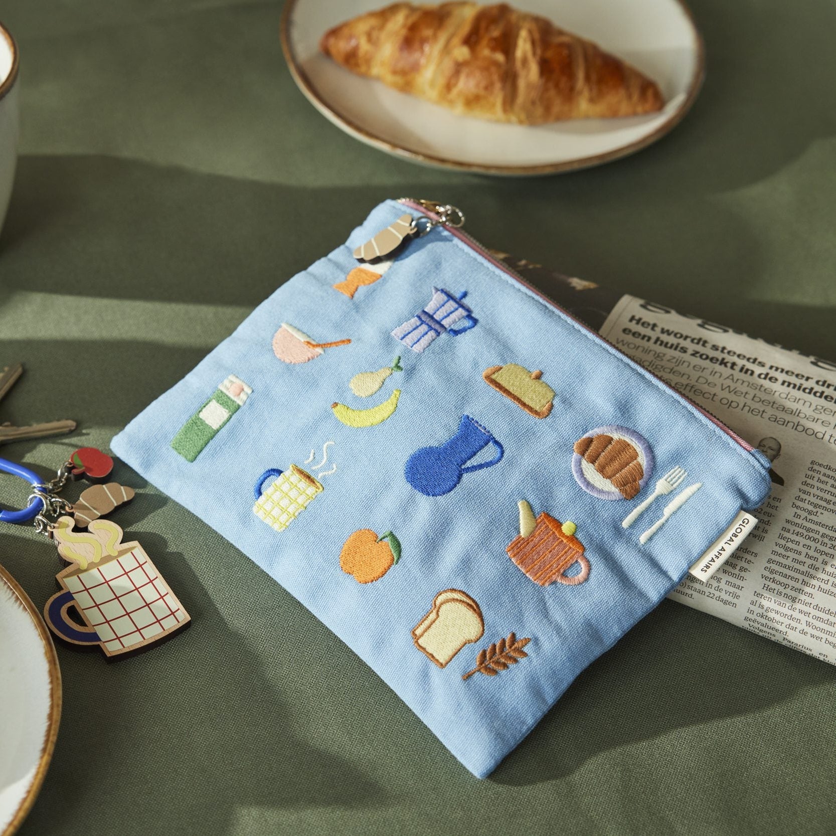 - Zacht stoffen etui met kleurrijke ontbijtilustraties